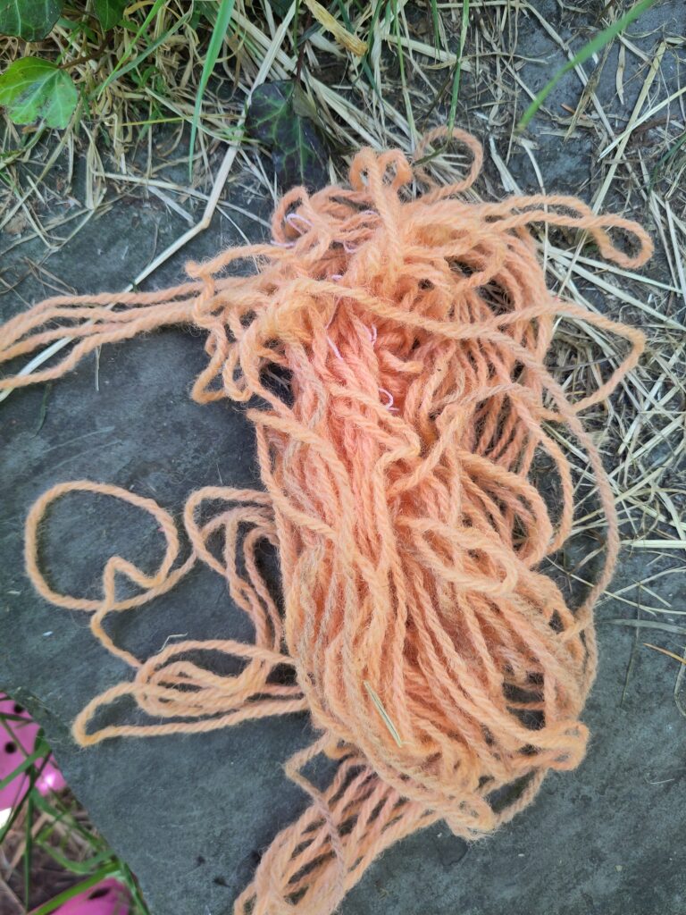 Trying to cold mordant this with iron sulphate didn’t work at all! But I didn’t really expect this as there was probably not enough madder dye was present to bring out purple, or more likely, the initial addition of alum in the initial brew kept the colour orange.