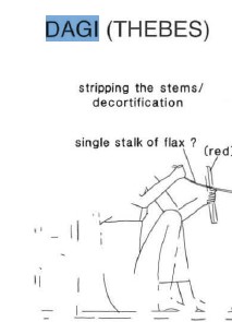 Back to the Menna scene, I’m not 100% sure what is happening on the far right, above the tree. I wondered if the flax was being laid out to dry, or retted. In recent historic times flax would have been retted (rotted) and then hackled to break off the woody parts. In the retting process flax is either put in water or left on dewy fields so that it starts to break down or rett. The tomb of Menna shows the flax in nice neat square patches, maybe it is being wet retted in pools of water.