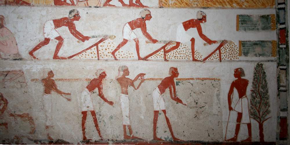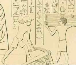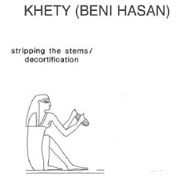This one is from the tomb of Paheri (TT 139 at Sheikh Abd el Qurna). The writing shows the conversation between the older man (rippling) and the younger who is carrying bundles to be worked . The old worker says: ‘Even if you bring me 11009 (sheaves), I shall ripple them all’. The young worker is replying: ‘Hurry up and stop talking’