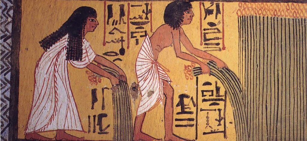 We sometimes think that how we do things is the way it’s always been done. But sometimes it’s worth questioning that. The ancient Egyptians were able to weave very fine cloth up to 60 threads per centimetre!1 How did they do that? Was it by the way we do things, or did they use some other method?While it might be thought that it was the spinning and weaving methods that were necessary to achieve such fine thread counts, the pre-spinning processing was highly significant. In order to achieve fine and neatly aligned flax fibres, the breaking up of fibres, as was carried out in post medieval Europe, was much reduced.